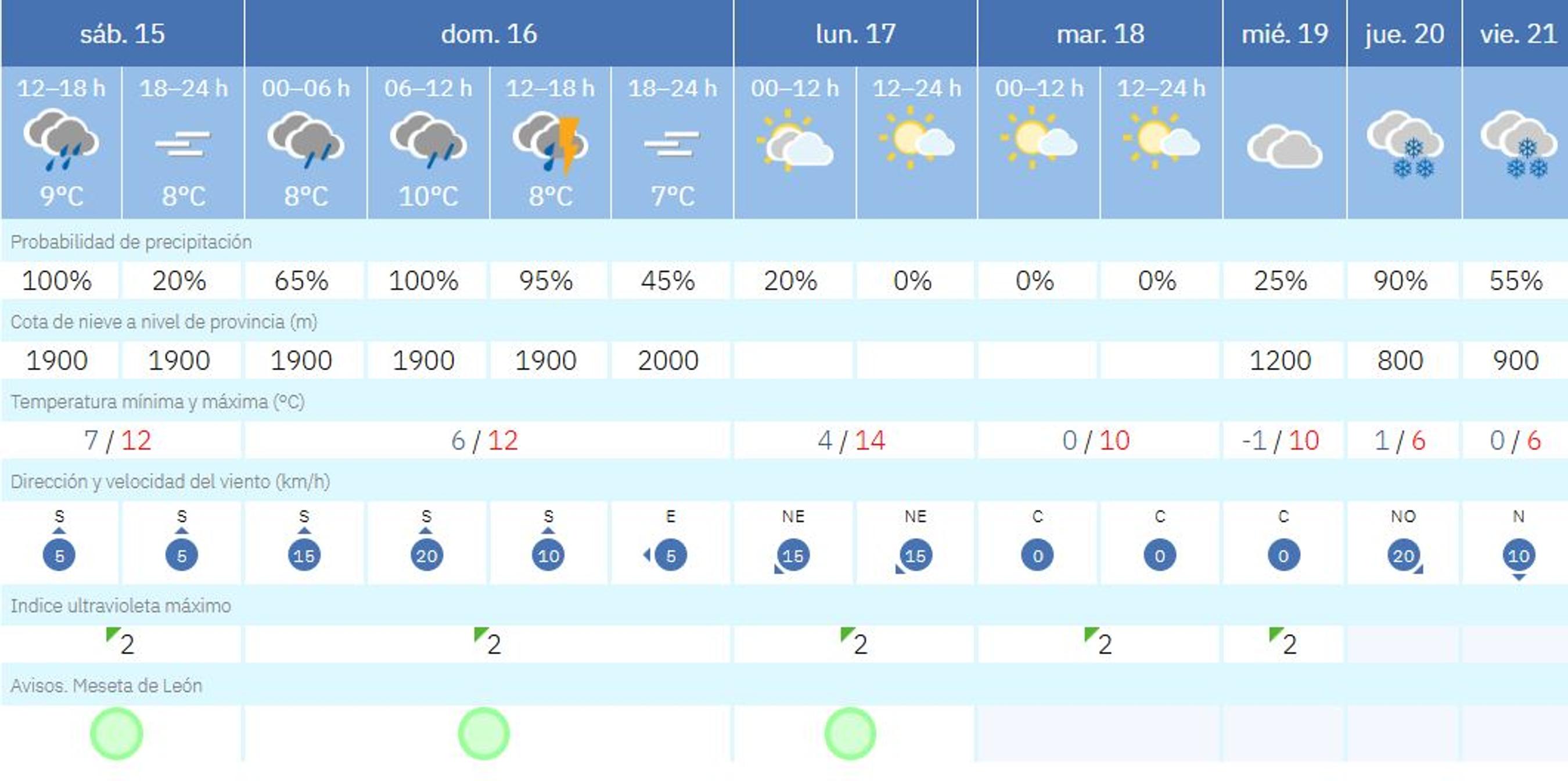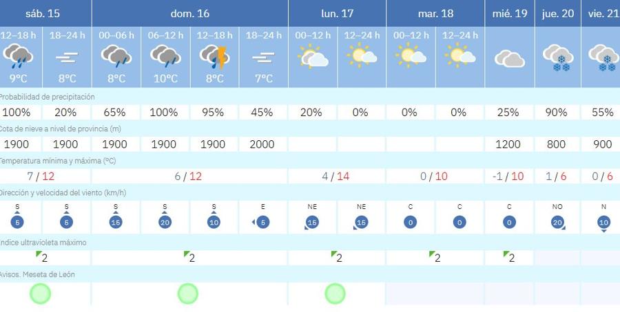 La cota de nieve se sitúa en 800 metros -la capital leonesa está por encima de ello- para el próximo jueves, 20 de noviembre, siendo además la posibilidad de precipitación abundante. La situación se mantiene para el viernes, aunque la cota subiría hasta los 900 metros y la probabilidad de que nieve se reduce a un 55%.
