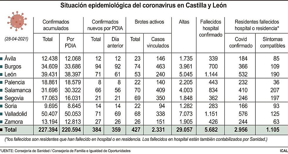 Castilla y León registra este miércoles 384 nuevos casos de la enfermedad Covid-19, con lo que su número actual acumulado es 227.394; de esa cifra, 220.594 se han diagnosticado con pruebas de infección activa.