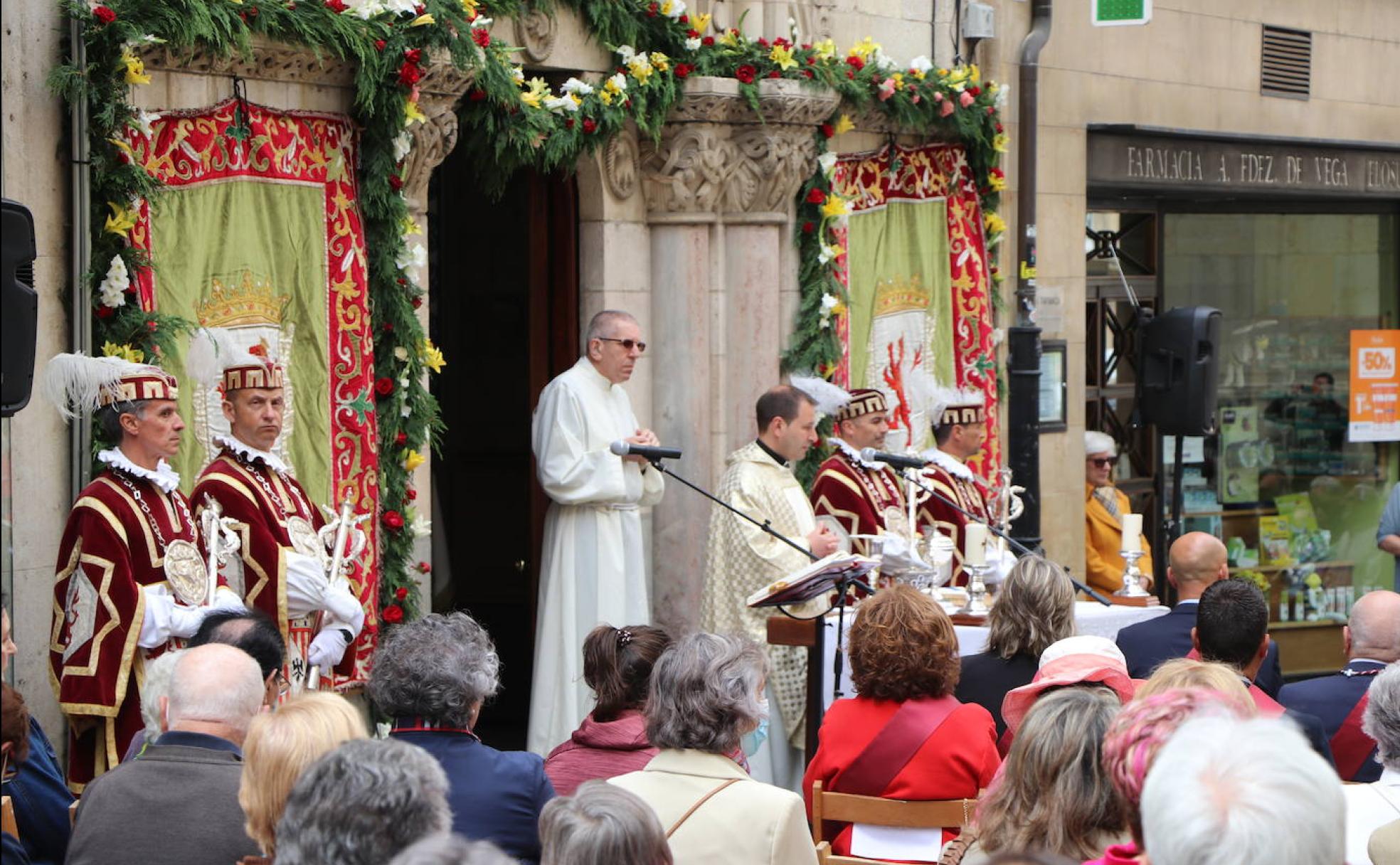Los maceros reales han acompañado un desfile que este año volvió a contar con la presencia de la banda de música hasta este improvisado altar junto a la capilla del Cristo de la Victoria. Para posteriormente custodiar la celebración eucarística en la calle Ancha.