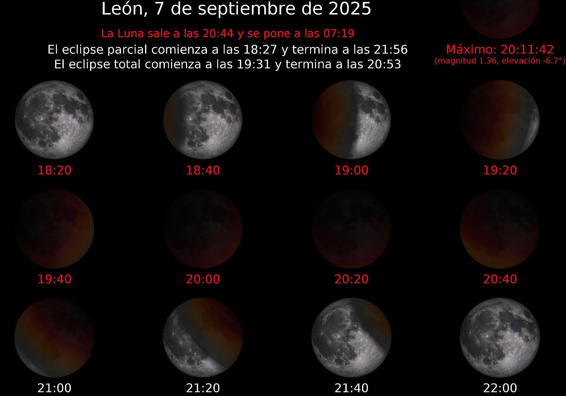 Uno parcial para 2026 y otro penumbral para 2027. Esos son los próximos eclipses de Luna previstos para España, que no volverá a ver uno total hasta finales de 2028. Y el de este 7 de septiembre no es total en toda España y en León lo es, y por muy poco.