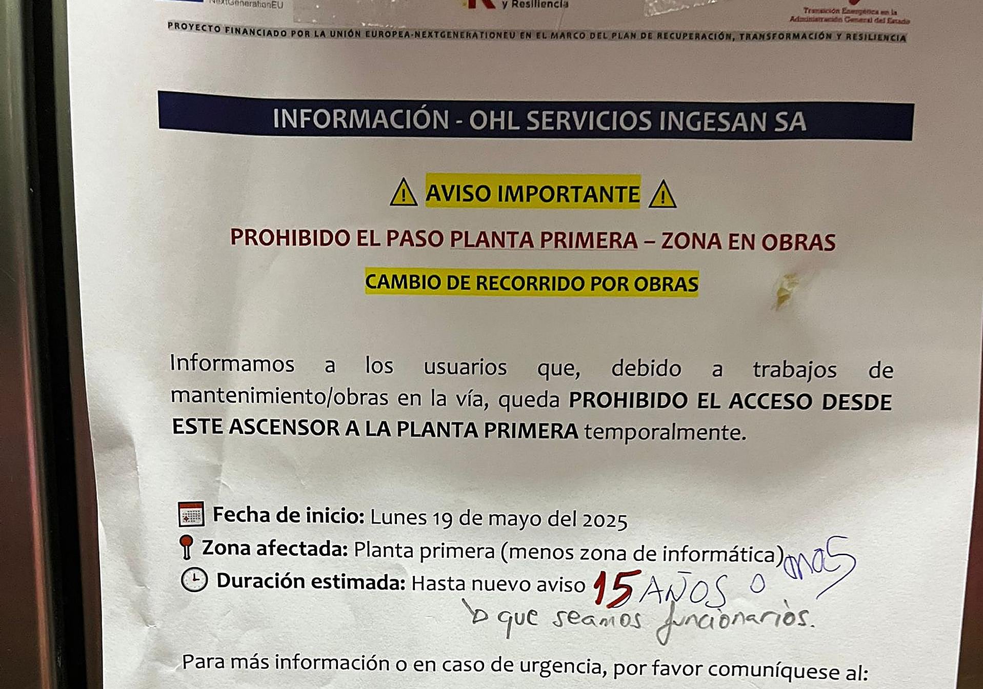 El mensaje recordaba la prohibición de acceso a la planta primera y establecía un cambio de recorrido. La fecha de inicio era el 19 de mayo y la duración estimada: «hasta nuevo aviso».