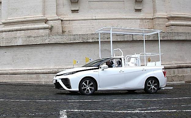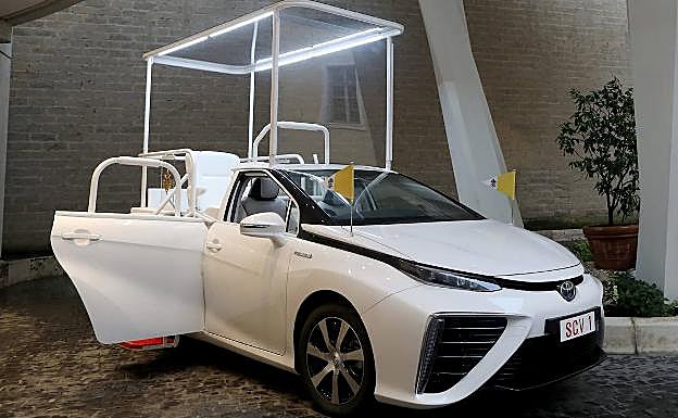 El Papa Francisco también podrá disfrutar desde ahora de la movilidad sin emisiones. Lo hará con un nuevo Papamóvil impulsado por hidrógeno, basado en el Toyota Mirai, que le ha sido obsequiado por parte de la Conferencia Católica de Obispos de Japón (CBCJ). Este tipo de vehículos únicamente emiten agua como residuo al circular.