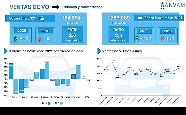 En lo que va de año, el mercado de ocasión acumula un total de 1.783.069 unidades vendidas, lo que supone un 10,8% más, aunque todavía un 5,2% menos que en el mismo periodo de 2019, lo que sitúa la ratio VO/VN en 2,3 a 1 hasta noviembre.