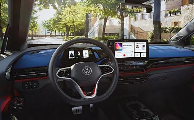 El concepto de manejo del ID.4 GTX es sencillo e intuitivo. El tablero de instrumentos viene sin teclas ni mandos físicos; esto le confiere un aspecto limpio y muy moderno. Con el volante multifunción, el conductor controla una pantalla compacta con una diagonal de 5,3 pulgadas donde se presentan los indicadores más importantes. En el borde derecho del volante hay un mando basculante que sirve para seleccionar las marchas. En el centro del tablero de instrumentos se encuentra la gran pantalla táctil para la navegación, la telefonía, los medios de comunicación, los sistemas de asistencia y la configuración del vehículo. De serie, tiene una diagonal de 10 pulgadas; en el paquete Infotainment 'Plus', de 12 pulgadas. El manejo por voz natural de serie 'Hola ID.', que comprende muchas frases cotidianas, constituye otro nivel operativo.