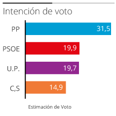 El ganador de los comicios volvería a ser el PP con un 31,5% de intención de voto, seguido del PSOE, con un 19,9%, Unidos Podemos (es decir la suma de Podemos y sus confluencias) se quedaría en un 19,7% y Ciudadanos, con un 14,9%.