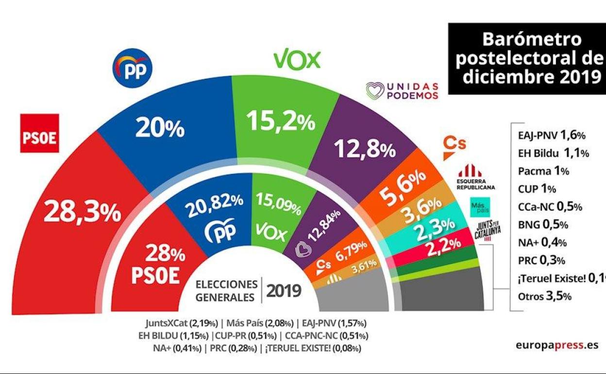 En concordancia con esa falta de arrepentimiento generalizado, la estimación de voto del CIS para unas hipotéticas elecciones que se hubieran celebrado en diciembre no dista mucho de las cifras del 10-N. Los porcentajes de voto se mantienen prácticamente iguales con la única excepción del correspondiente a Cs que, no obstante, sólo bajaría un punto, del 6,8% al 5,6%.