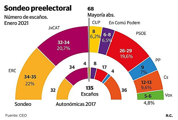 Ciudadanos quedaría en cuarto lugar, con 12-13 escaños, muy lejos de los 36 que registró hace cuatro años y que le dieron la victoria a Inés Arrimadas. El PP mejoraría hasta 9, la CUP doblaría hasta ocho, los comunes perderían posiciones de 6 a 8 y Vox podría entrar con fuerza con 5-6 escaños. El PDeCAT, según el CEO, no obtendría representación.