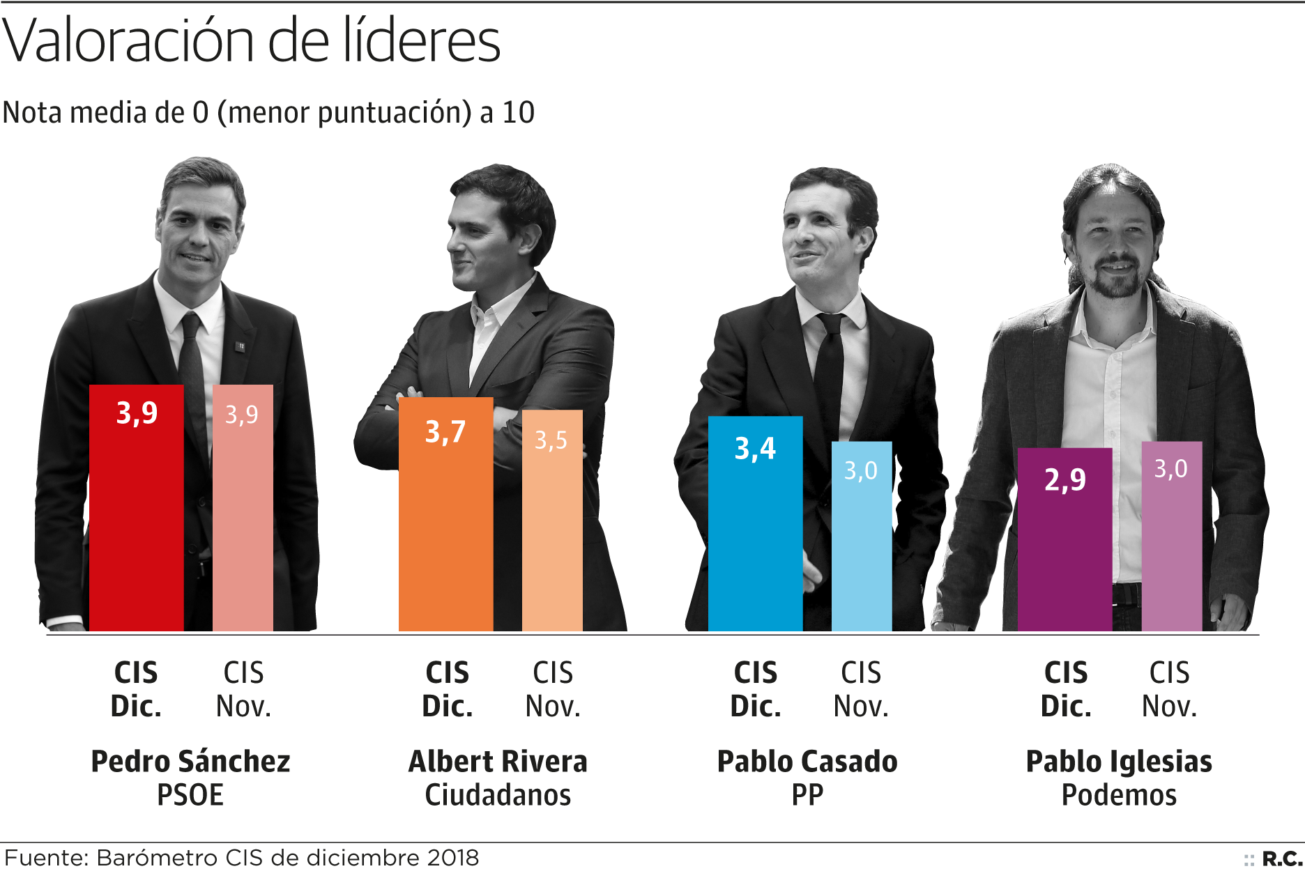 Los populares se estancan en el mismo 19,1% de los sufragios que le adjudicó la encuesta de noviembre. No obstante, hay una nota positiva. La formación presidida por Pablo Casado se afianza como segunda fuerza política, una posición por la que peleaba codo con codo con Ciudadanos hasta hace dos meses. Los liberales de Albert Rivera bajan tres décimas con respecto al anterior barómetro y cosecharían un 17,9% de los votos.