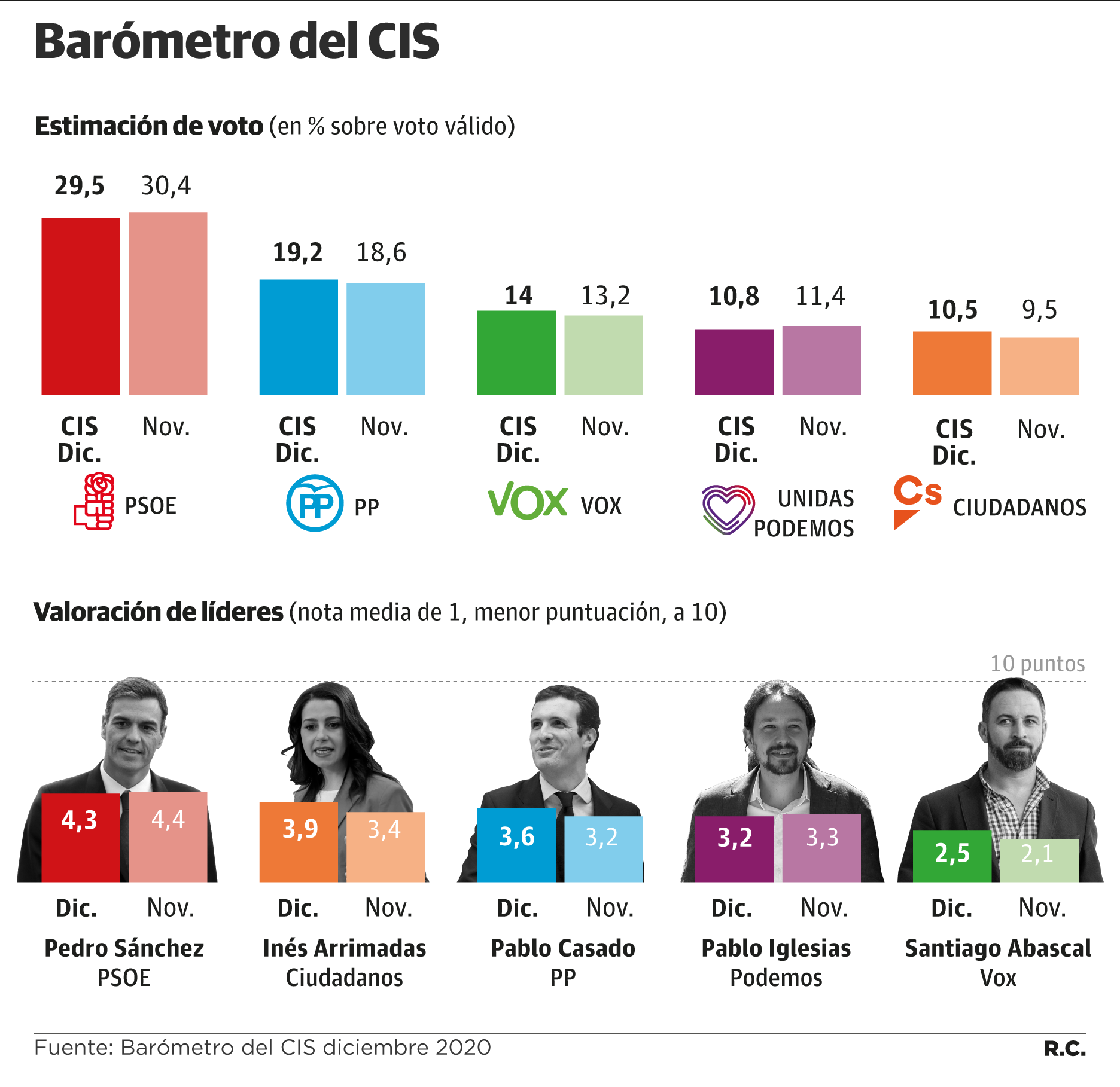 El estudio se realizó entre el 1 y el 9 de diciembre, al mismo tiempo que se aprobaban en el Congreso los Presupuestos para 2021 con una alianza que al parecer no gusta a parte del electorado socialista. El PSOE ganaría las elecciones con el 29,5% de los votos, en septiembre la estimación era de 31,5, y el mes pasado de 30,4. Con todo, su ventaja sobre el PP aún es sólida, 10,3 puntos, pero no se puede olvidar que hace dos meses era de 12.