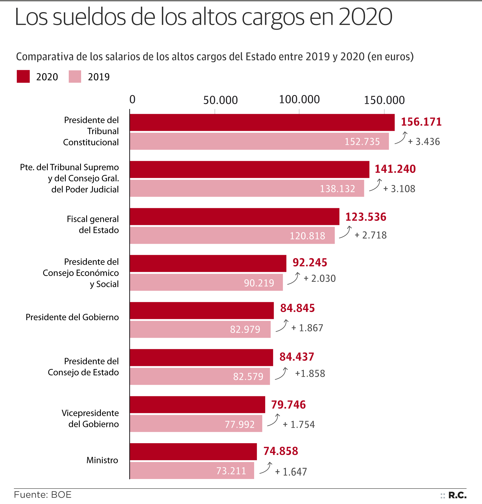 Pedro Sánchez y los 22 miembros de su Ejecutivo también se beneficiarán de la subida salarial a los funcionarios aprobada este martes por el Consejo de Ministros. El presidente del Gobierno pasará de cobrar 82.978 euros al año a 84.845, por lo que percibirá unos 1.867 euros más anuales, es decir un 2,25% más. Sus cuatro vicepresidentes Carmen Calvo, Pablo Iglesias, Nadia Calviño y Teresa Ribera, verán elevados sus sueldos hasta los 79.746 euros anuales frente a los 77.991 que cobró en 2019 Calvo como número dos del Ejecutivo socialista. Por su parte, los 18 ministros que integran el primer Gobierno de coalición de la reciente democracia verán como su salario se sitúa en los 74.858 euros anuales, 1.647 euros más que el año pasado cuando estaba en 73.211 euros.