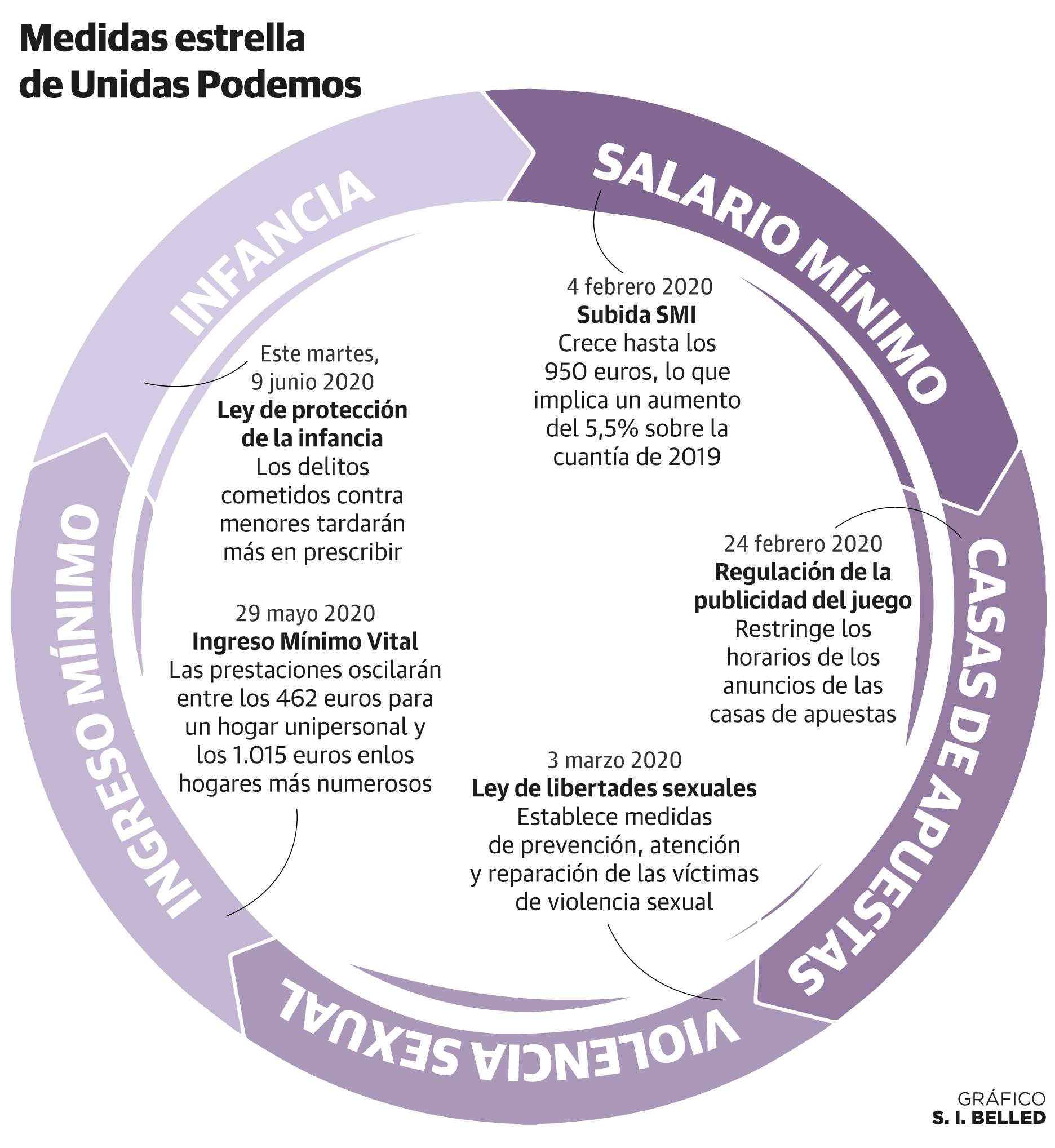El líder de Unidas Podemos, Pablo Iglesias, se mostraba cauto en noviembre del año pasado cuando, días antes de las generales del 10 -N, reconocía en una entrevista en este periódico que eran «conscientes de los límites que establece la Unión Europea, de que vivimos en una democracia limitada». Era un modo de ir concienciando a los votantes de la formación morada de que el pacto con el PSOE, que en ese momento no estaba sellado, iba a limitar el alcance de las medidas estrella de su programa electoral. «Asaltar» el cielo podía esperar, lo crucial era llegar primero hasta él. Sin embargo, cinco meses después de entrar en el Gobierno de coalición y en mitad de una pandemia de alcance mundial, la formación morada ha logrado sacar adelante –o al menos iniciar los trámites legislativos– de sus principales propuestas.