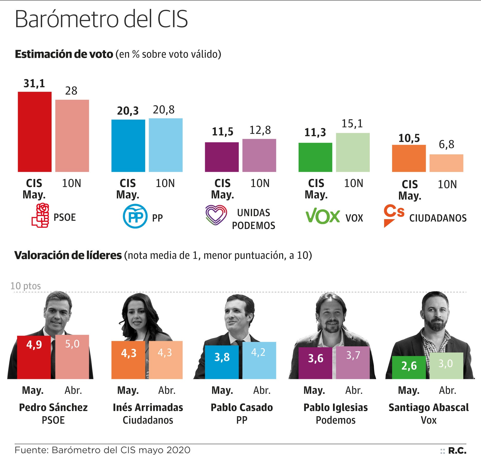 El estudio del CIS se efectuó entre el 4 y 13 de mayo y revela que, a pesar de que los insatisfechos con la actuación del Gobierno superan a los satisfechos, Pedro Sánchez no experimenta una erosión política. Es el líder mejor valorado con un 4,9 de nota media, una décima menos que abril; le sigue la presidenta de Ciudadanos, Inés Arrimadas, con 4,3, la misma valoración que hace un mes; Pablo Casado se queda con un 3,8, cuatro décimas menos; Pablo Iglesias, 3,6, pierde una décima; y Santiago Abascal, 2,6, se deja cuatro décimas.