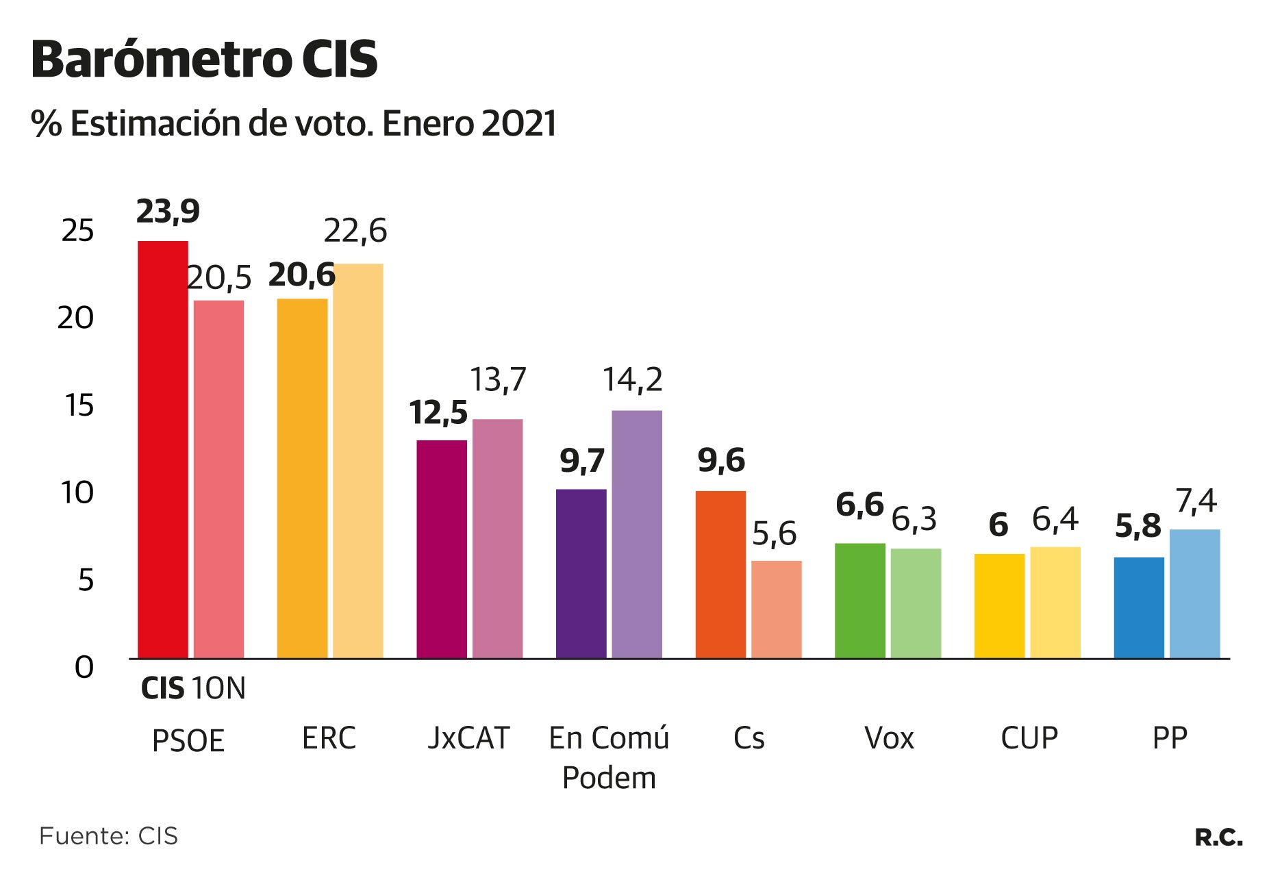 El CIS preelectoral trae consigo otros datos remarcables. Ratifica el descalabro de Ciudadanos que, de la primera posición en 2017, pasaría a la cuarta con entre 13 y 15 escaños. Vox estaría, además, en condiciones de sobrepasar al PP que, aunque remontaría respecto a los cuatro escaños de los comicios convocados por Mariano Rajoy bajo el artículo 155 de la Constitución, se quedaría en siete.