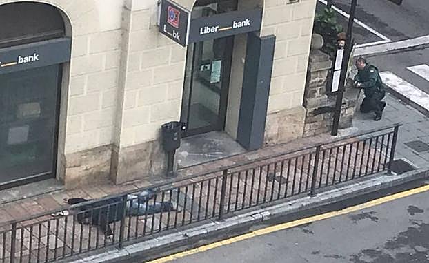 Un atracador muerto (se ha suicidado) y otro detenido, un guardia civil herido por arma de fuego en un brazo y tres rehenes liberados e ilesos. Este es el balance general de la tensa mañana de este martes que se vivía en el centro de Cangas de Onís con el intento de atraco a una sucursal bancaria de Liberbank de la avenida de Covadonga.