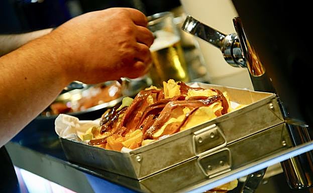 "Unas patatas fritas, hechas en el momento, ¿no es maravilloso?", ha defendido mientras los asistentes al taller degustaban dobles de cerveza "bien tirada" acompañados de unas patatas recién preparadas. Partiendo de esa base, el taller de Hormaechea ha ido evolucionando. El cocinero ha redoblado su apuesta: la patata frita acompañada de una anchoa y, después, de un filete. "Siempre en un tamaño capaz de ser sostenido por un palillo", ha advertido el chef. "Es una cosa estupenda que te tomas de vez en cuando, pero no es un plato, ni es una ración. Te permite comer dos tapas e ir a comer a otro sitio. Es una tapa", ha insistido.