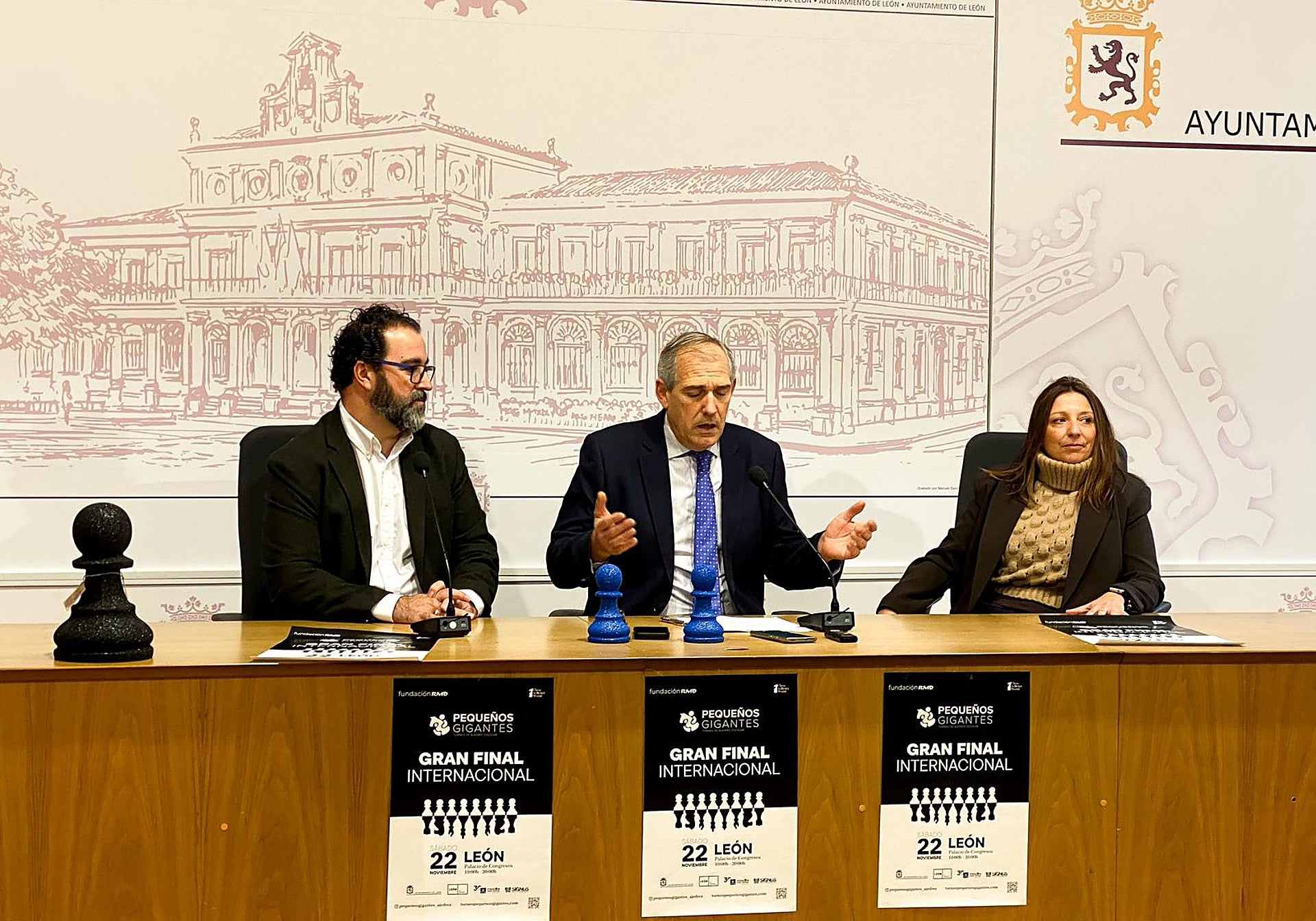 León acogerá el próximo 22 de noviembre la Gran Final Internacional del torneo escolar de ajedrez 'Pequeños Gigantes'. Así lo han anunciado este miércoles en el Salón de Reyes del Ayuntamiento de León Vicente Canuria, Concejal de Deportes del Ayuntamiento de León, Matilde López Vicepresidenta de Fundación RMD, Nicolás González, Director Comercial de Fundación RMD y María Pilar Lasheras, Gerente de Aguas de León.