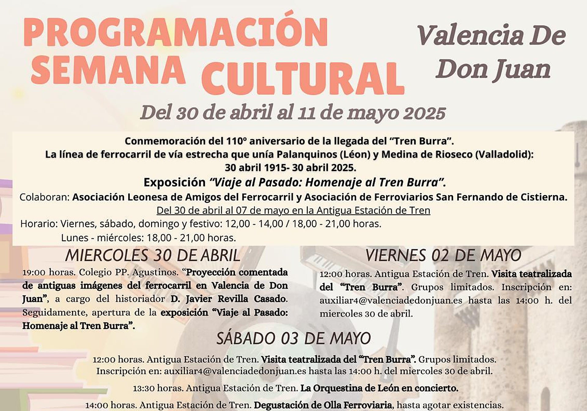 Este pasado fin de semana se ha podido disfrutar de la visita teatralizada «Tren burra» o la proyección comentada de antiguas imágenes del ferrocarril de Valencia de Don Juan a cargo del historiador D. Javier Revilla Casado. Durante la jornada del martes 6 de mayo los alumnos de la Escuela Municipal de Música de Valencia de Don Juan y el profesor de dulzaina D. Antonio Prieto llevarán a cabo un Concierto de Música Tradicional Leonesa. Al día siguiente, tendrá lugar el evento «cuentos de mujer en voz de hombre» contados por Manuel Ferrero. Entre las actividades destacadas del jueves 8 se encuentra la Jornada de Puertas Abiertas de la Escuela Municipal de Música de Valencia de Don Juan. Por su parte, el viernes 9 tendrá lugar la Presentación del Libro «Sinfonía para dos». El fin de semana cerrará la Semana Cultural con un Concierto de la Banda de Música y un taller de maquetas entre otros eventos.