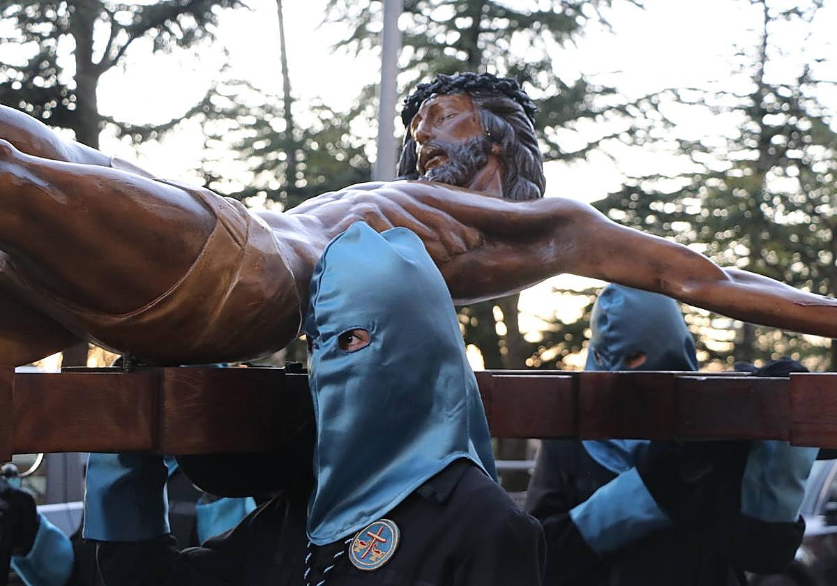 El Santo Cristo de la Bienaventuranza adelanta el horario de su Vía Crucis Procesional y recorre con la noche cayendo las calles del barrio de San Claudio