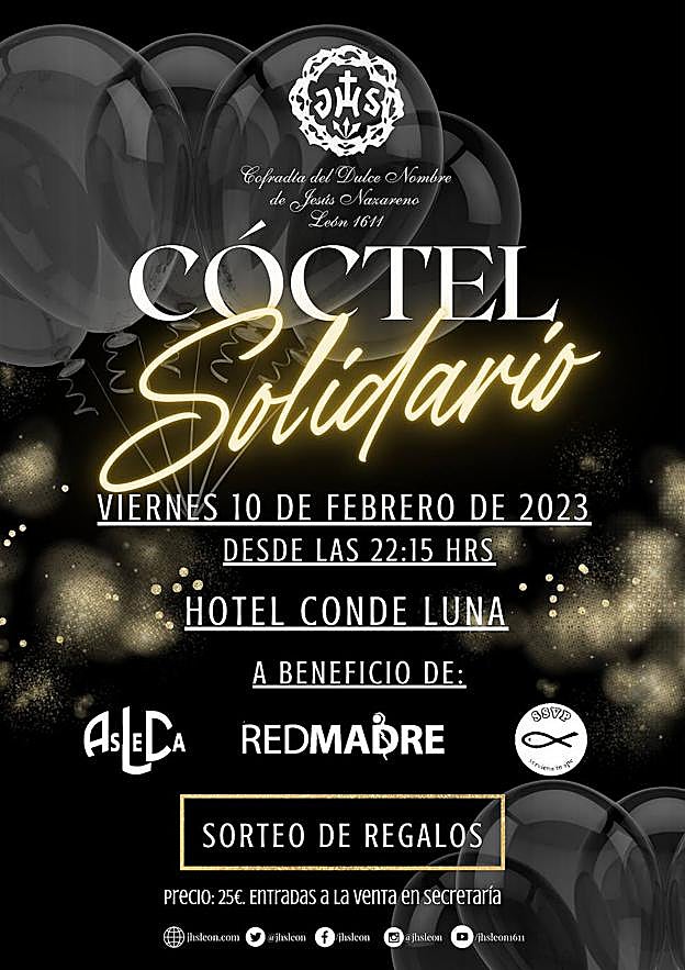 Posteriormente, a partir de las 22.15 horas, se celebrará un cóctel benéfico en el Hotel Conde Luna, a favor de las mismas asociaciones, y durante el cual se sortearán numerosos regalos entre los asistentes. Las entradas para el cóctel, al precio de 25 euros, podrán adquirirse en la secretaría de la Cofradía, de lunes a jueves en horario de 18.30 a 20.30 horas.