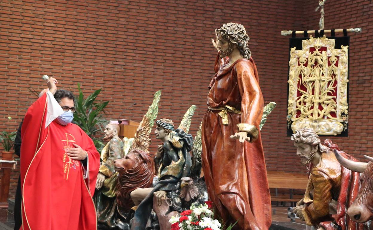 No faltaron las palmas, seña de identidad de la cofradía, ni tampoco el titular, que presidía el altar acompañado de las figuras de los cuatro evangelistas de Melchor Gutiérrez.