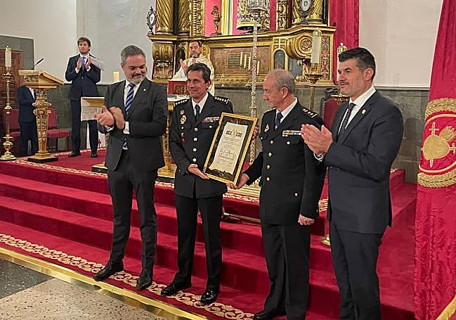 El comisario jefe provincial, Miguel Ángel Ballesteros, recogía el diploma de escolta de honor de manos de la junta de seises, con el abad Hugo Medina a la cabeza, y en compañía de otros cargos de rango del cuerpo.