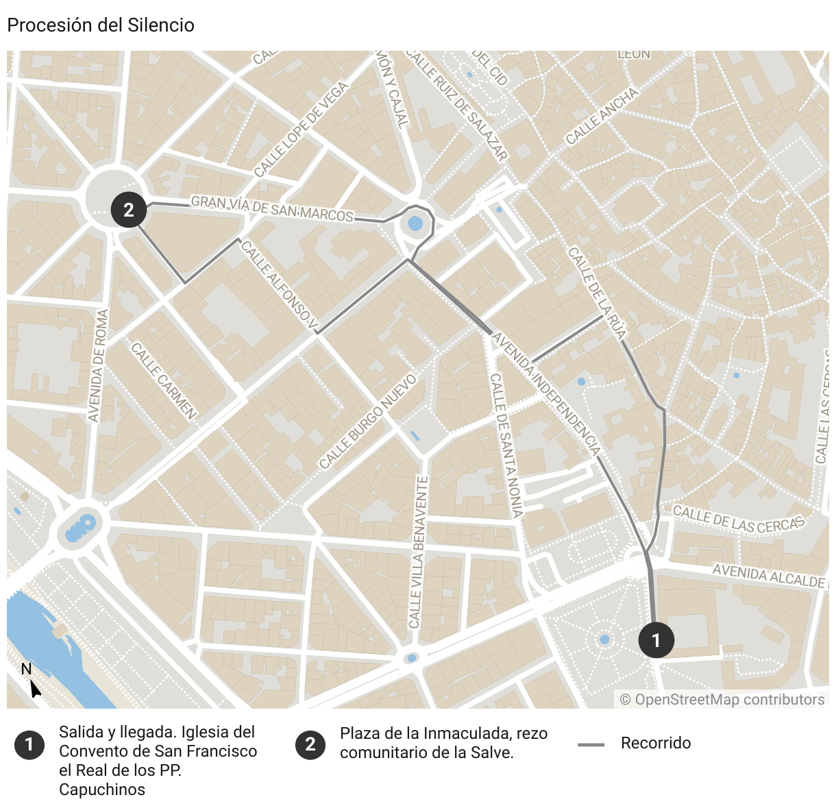 La Procesión Jesús Camino del Calvario será la primera en tomar salida desde Santa Marina. Pronto se unirá Minerva, con su Virgen de la Amargura y una importante colección de su patrimonio. Y sin ruido caminará el Silencio por las calles de la capital.