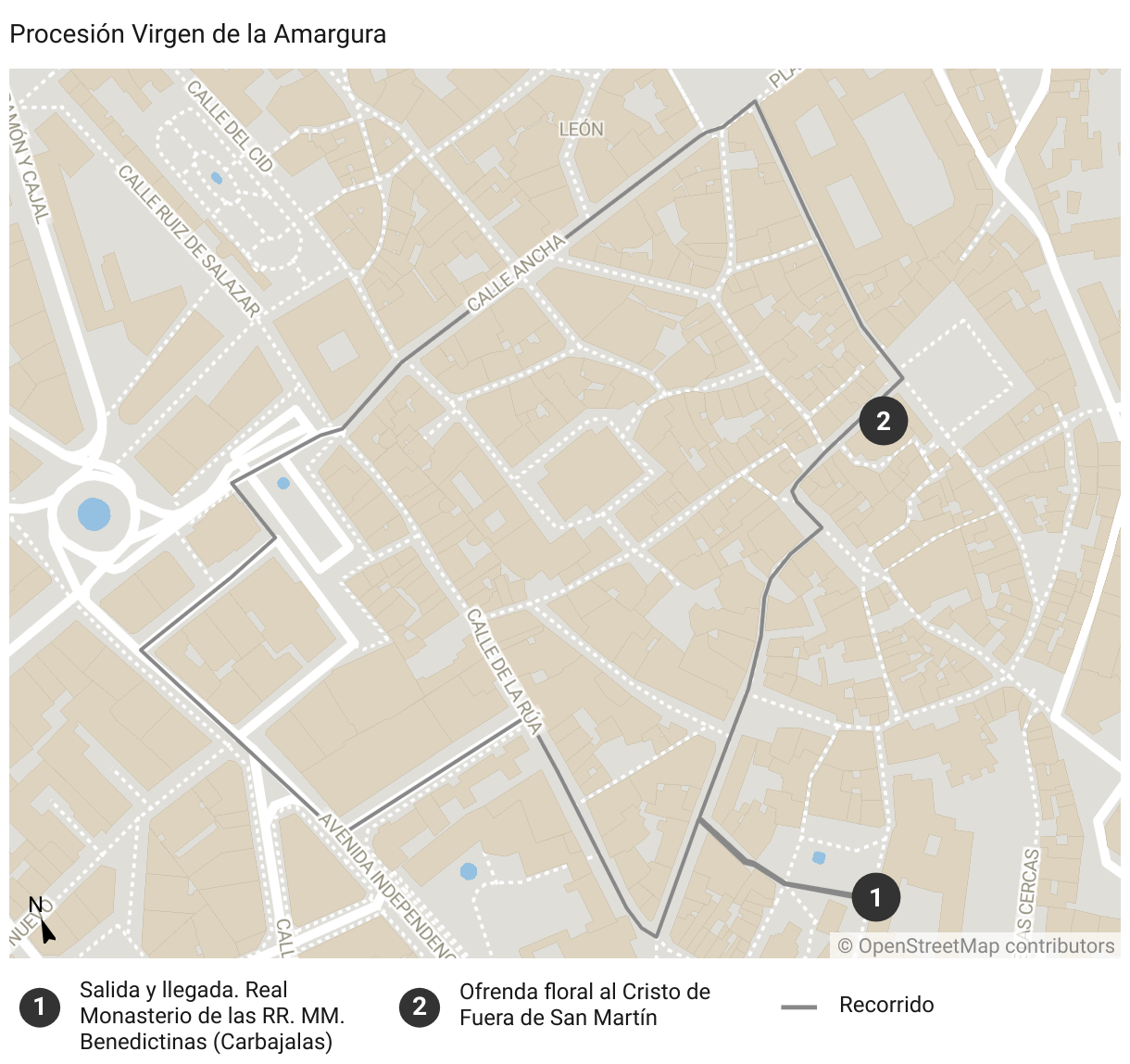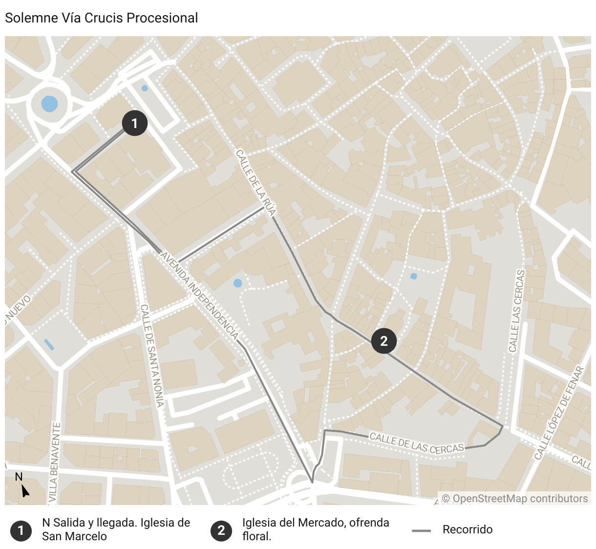 Itinerario: Iglesia de San Marcelo, Legión VII, Independencia, Plaza de San Francisco, Las Cercas, Puerta Moneda, iglesia del Mercado (ofrenda floral) Herreros, Plaza de las Concepciones, Rúa, General Lafuente, Independencia, Legión VII, Iglesia de San Marcelo.