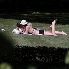 Dos mujeres toman el sol en ropa de baño en el parque del Retirode Madrid en el mes de mayo.