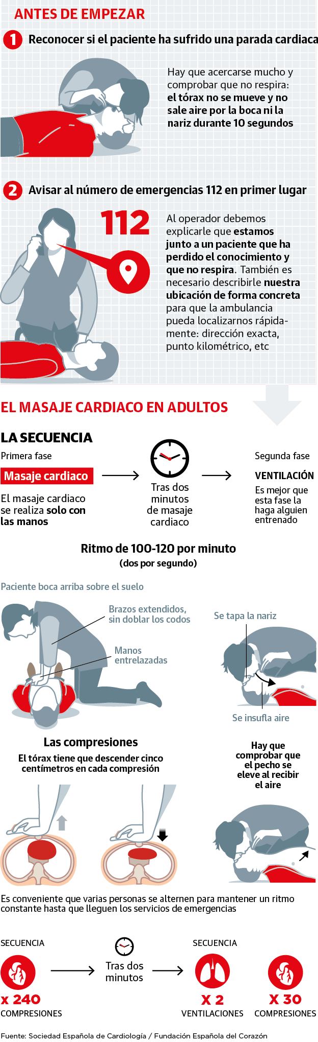 Los médicos ya hablan del 'efecto Eriksen' para alertar sobre la necesidad de que cualquier ciudadano debería saber realizar una RCP. En Dinamarca, los niños la aprenden en el colegio. Cada año se producen en España unas 52.300 paradas cardíacas, ya sea por infarto o por cardiopatías congénitas que no se detectan en controles médicos. De ellas, 22.300 se producen en los hospitales y 30.000 fuera de ellos. De estas últimas, solo se recuperan entre el 5 y el 10%. Cuando a una persona se le para el corazón, el cerebro se queda sin oxígeno. Si en cuatro minutos no se interviene, las posibilidades de supervivencia disminuyen muchísimo. Saber realizar una RCPes tan crucial como llamar al 112.
