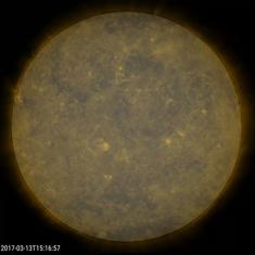 Así, una animación con imágenes del SDO ha mostrado este miércoles el desarrollo de la actividad solar entre el 14 y el 17 de marzo de este año 2017, con una combinación de una imagen ultravioleta extrema mezclada con el Sol filtrado sin manchas como puntos de referencia, para lo que cualquier espectador tendría dificultades a la hora de distinguir si el Sol está girando o no.