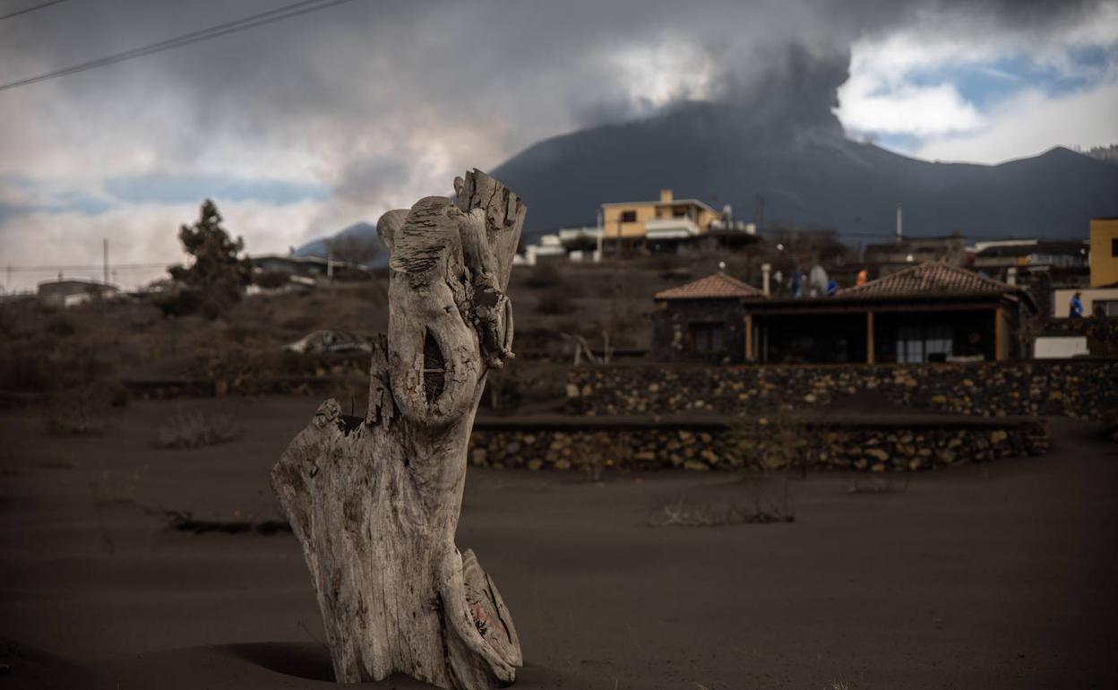 Vista de la ceniza acumulada en Las Manchas, con el volcán de Cumbre Vieja al fondo. KIKE RINCÓN / EP