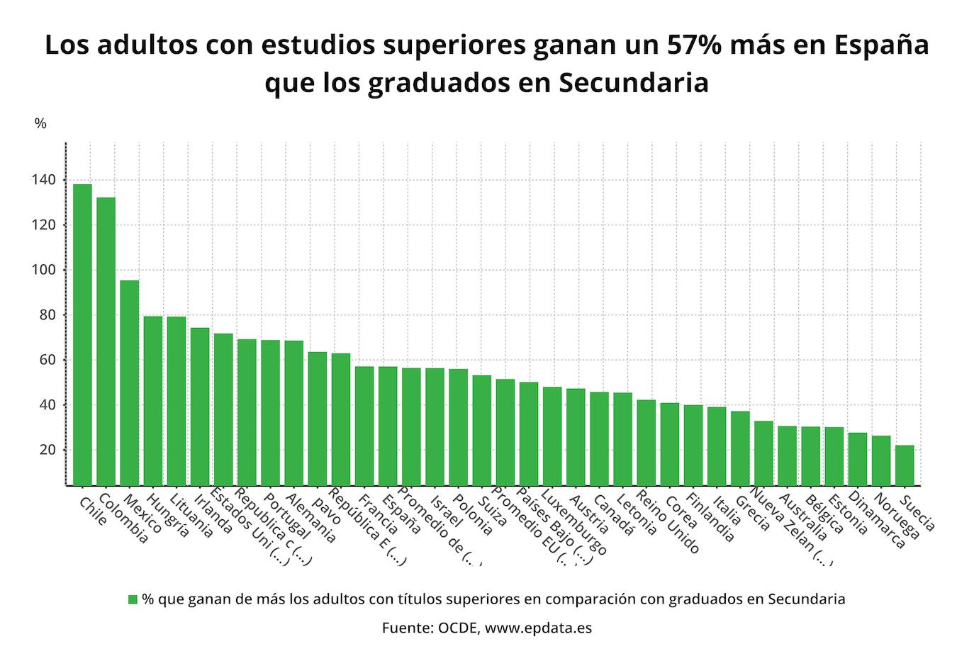 El informe de la institución internacional, que ha analizado la situación educativa de sus 36 países miembro, apunta que, en España, el 44% de la población entre 25 a 34 años ha completado la Educación Terciaria, un nivel similar al del conjunto de la OCDE, que se sitúa en el 43%. Pero lo que destaca la entidad es que esa Educación Terciaria «tiene un fuerte impacto positivo en el mercado de trabajo». Así, los adultos (entre 25 y 64 años) con estudios terciarios ganan un 57% más que los que sólo tienen estudios secundarios.