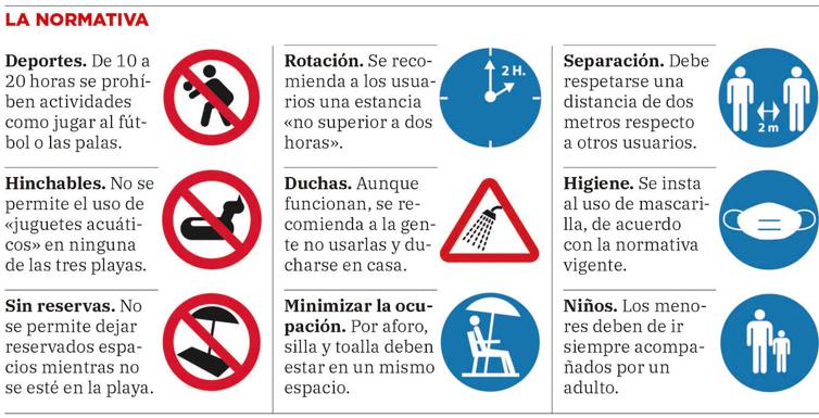 La regidora remarcó que todas las medidas están pensadas teniendo en cuenta «lo que mayoritariamente hace la gente en la playa, que es bañarse y tomar el sol». En esa línea, entre las 10 y las 20 horas estará prohibida cualquier práctica deportiva sobre la arena, como jugar al fútbol o a las palas, con dos únicas excepciones: la actividad propia de las escuelas de surf y las que organiza el Patronato Deportivo Municipal. Tampoco estará permitido el uso de jueguetes acuáticos, como hinchables.