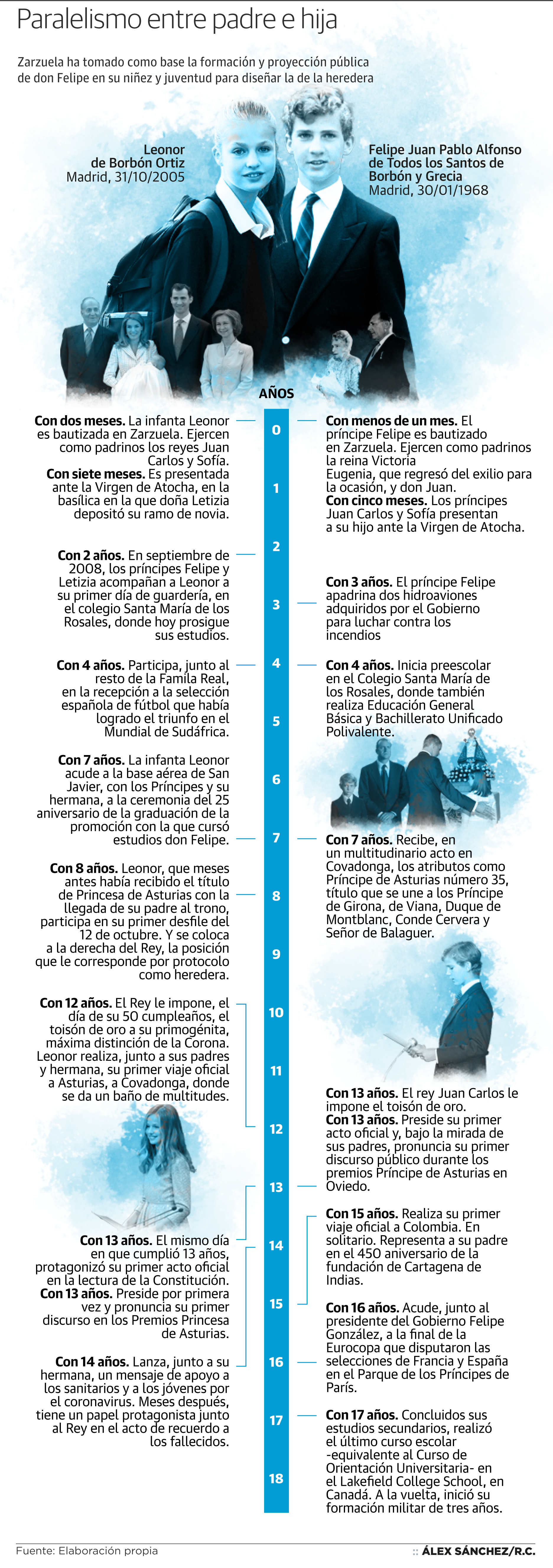 Aquel 2018 en el que Leonor -el 8 de septiembre, Día de Asturias- se coronó en Covadonga, en su primer viaje oficial al Principado, la heredera de la Corona dio otro paso de gigante en su proyección pública, al participar el día de su cumpleaños, el 31 de octubre, en la lectura del primer artículo de la Constitución, en un acto en el que se conmemoraban los cuarenta años de la Carta Magna. Leonor debutó en los Premios Princesa de Asturias al año siguiente, en 2019. Con 13 años, a unos días de cumplir los 14. El príncipe Felipe lo hizo con 13 años y nueve meses, en 1981. Para una y otro aquel momento marcó un punto de inflexión. Pero sus infancias en poco se parecen.