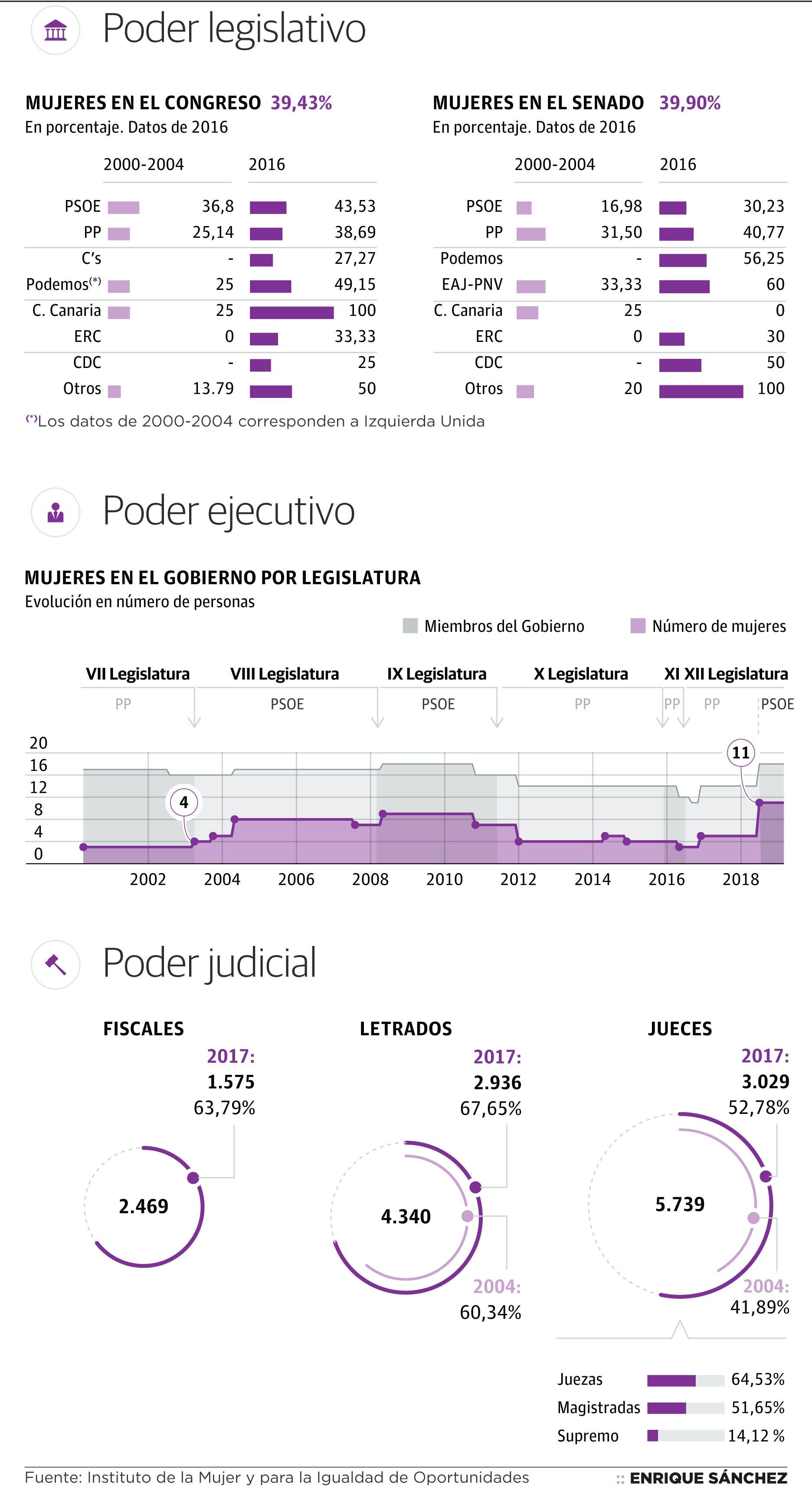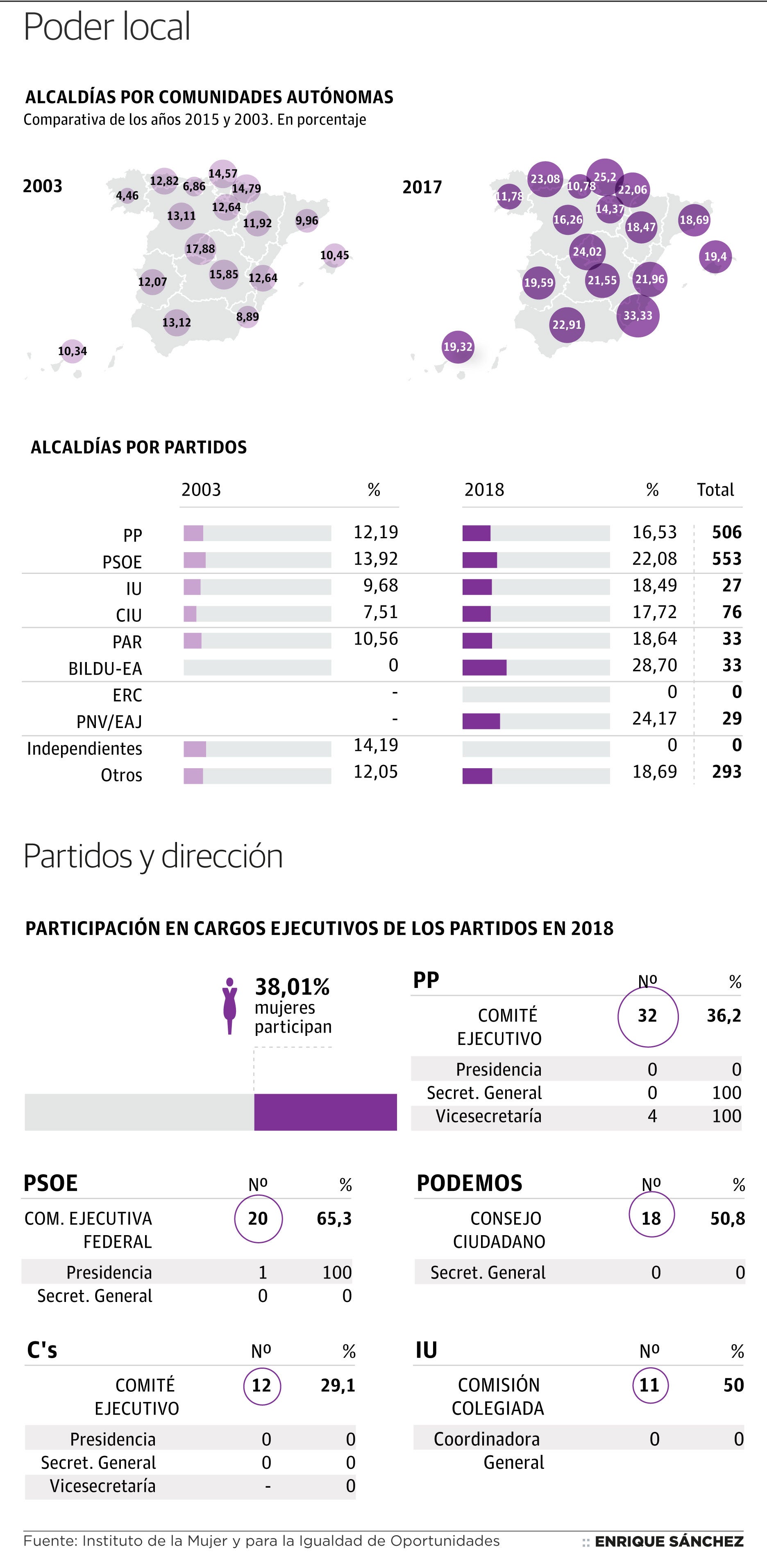 Sólo el 19% de los ayuntamientos están dirigidos por alcaldesas; apenas el 14% de los magistrados del Tribunal Supremo son mujeres; en las Ejecutivas de los principales partidos políticos las mujeres representan de media el 38% pero todos sus líderes nacionales son hombres. El Gobierno de Pedro Sánchez ha sido el primero en el que el número de ministras ha superado al de ministros, pero en las próximas elecciones generales no hay candidatas a la Presidencia del Gobierno: se les ha reservado el segundo puesto y se muestra como un triunfo.