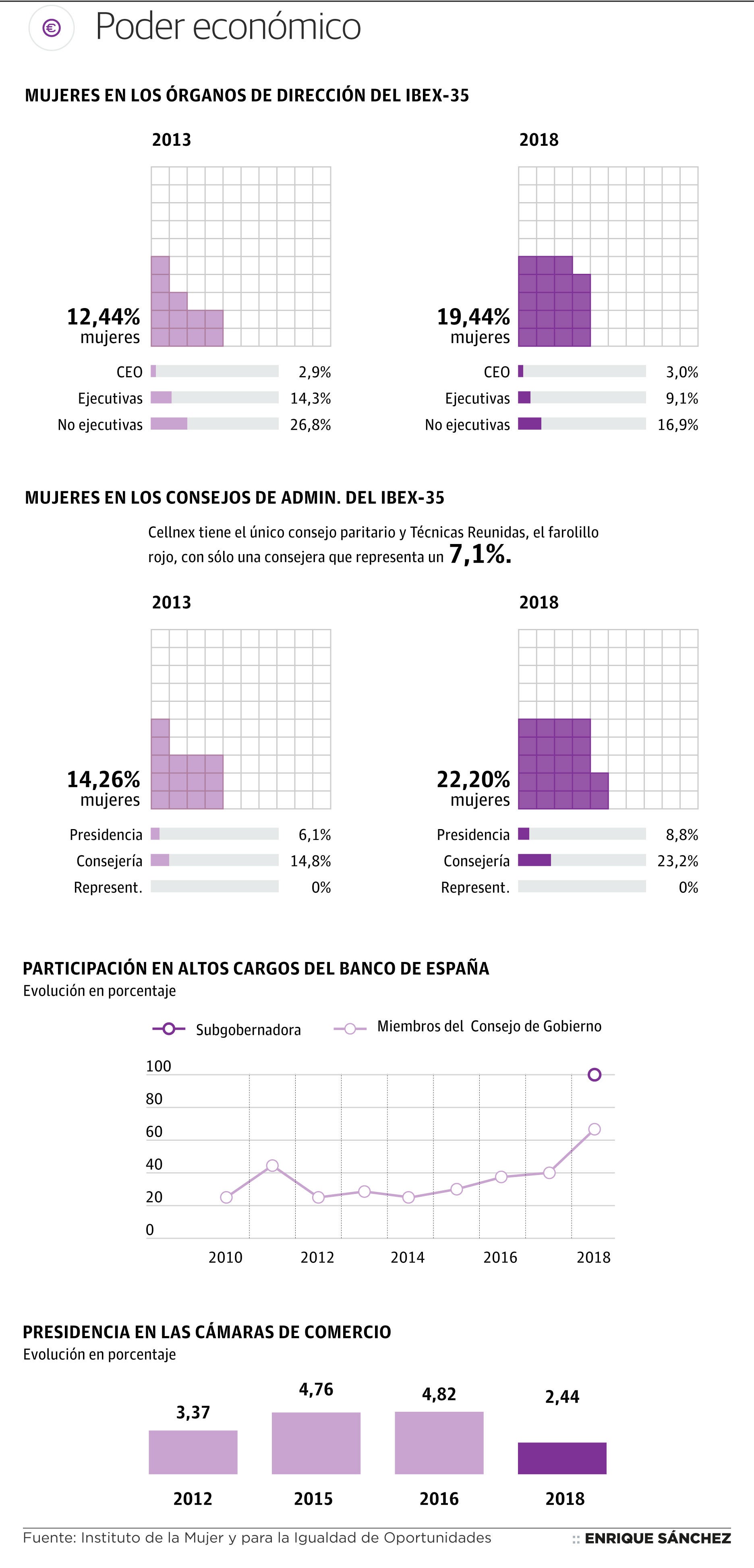 En el mundo económico, la representación femenina no es mucho más alta. No llega al 24% la presencia de las mujeres en los consejos de administración de las empresas del Ibex y sólo tres las dirigen. Nunca ha habido una gobernadora del Banco de España, ni presidenta de la CEOE, ni siquiera la Secretaría General de los principales sindicatos está ocupada por mujeres, y poco más del 2% de las cámaras de comercio tienen presidentas, según los datos del Instituto de la Mujer.