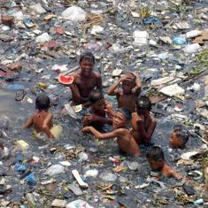 Unos niños juegan en un río lleno de basura en Manila.