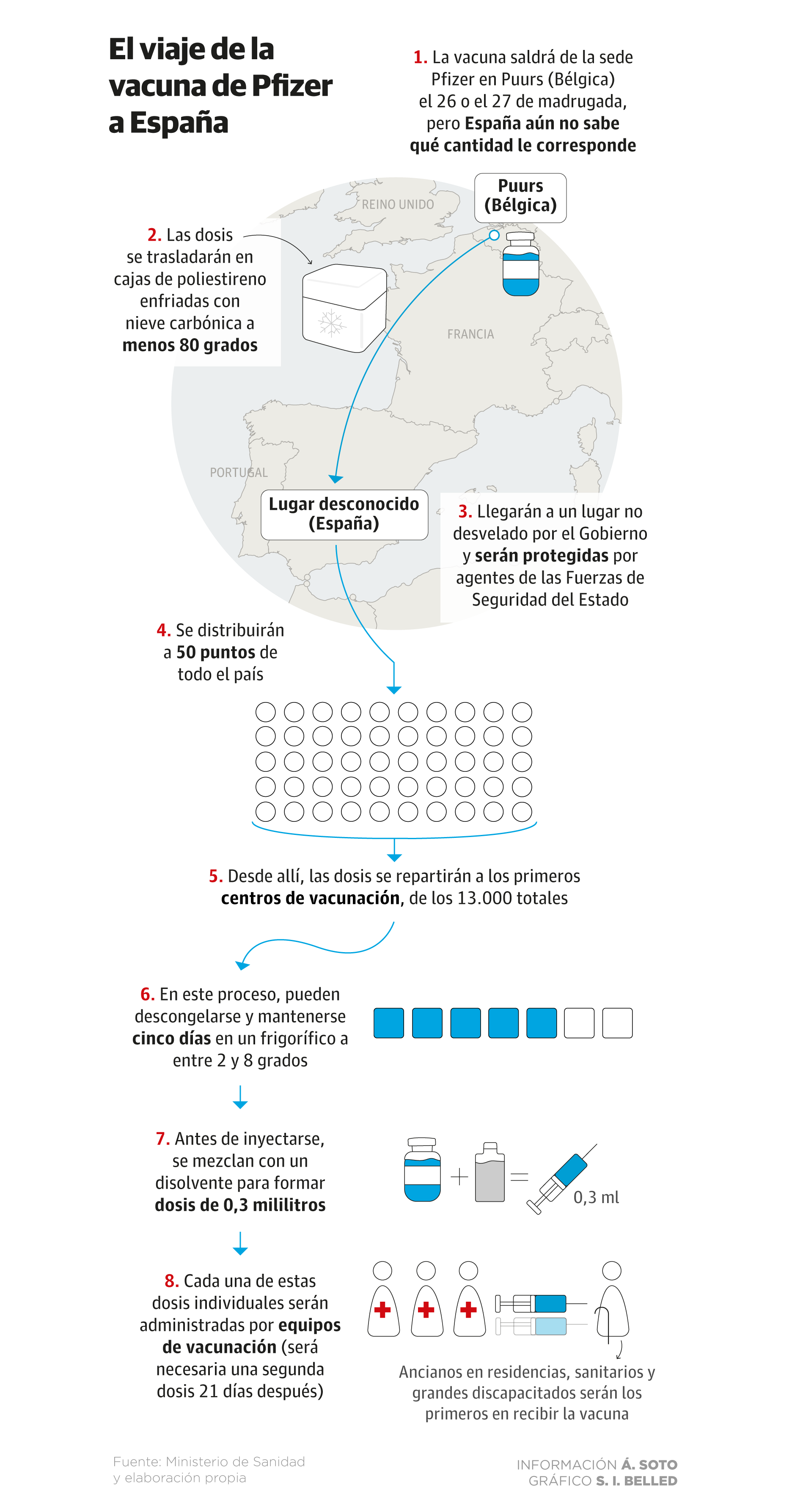 El ministro ofreció algunos detalles sobre el viaje de los primeros antídotos. Las dosis de Pfizer saldrán el día 26 desde las instalaciones de la farmacéutica en la localidad belga de Puurs. Aterrizarán en una ubicación de España que el Ministerio de Sanidad no ha hecho pública y allí empezarán a ser custodiadas por las Fuerzas y Cuerpos de Seguridad del Estado, dentro del operativo que los ministerios de Interior y de Sanidad están diseñando.