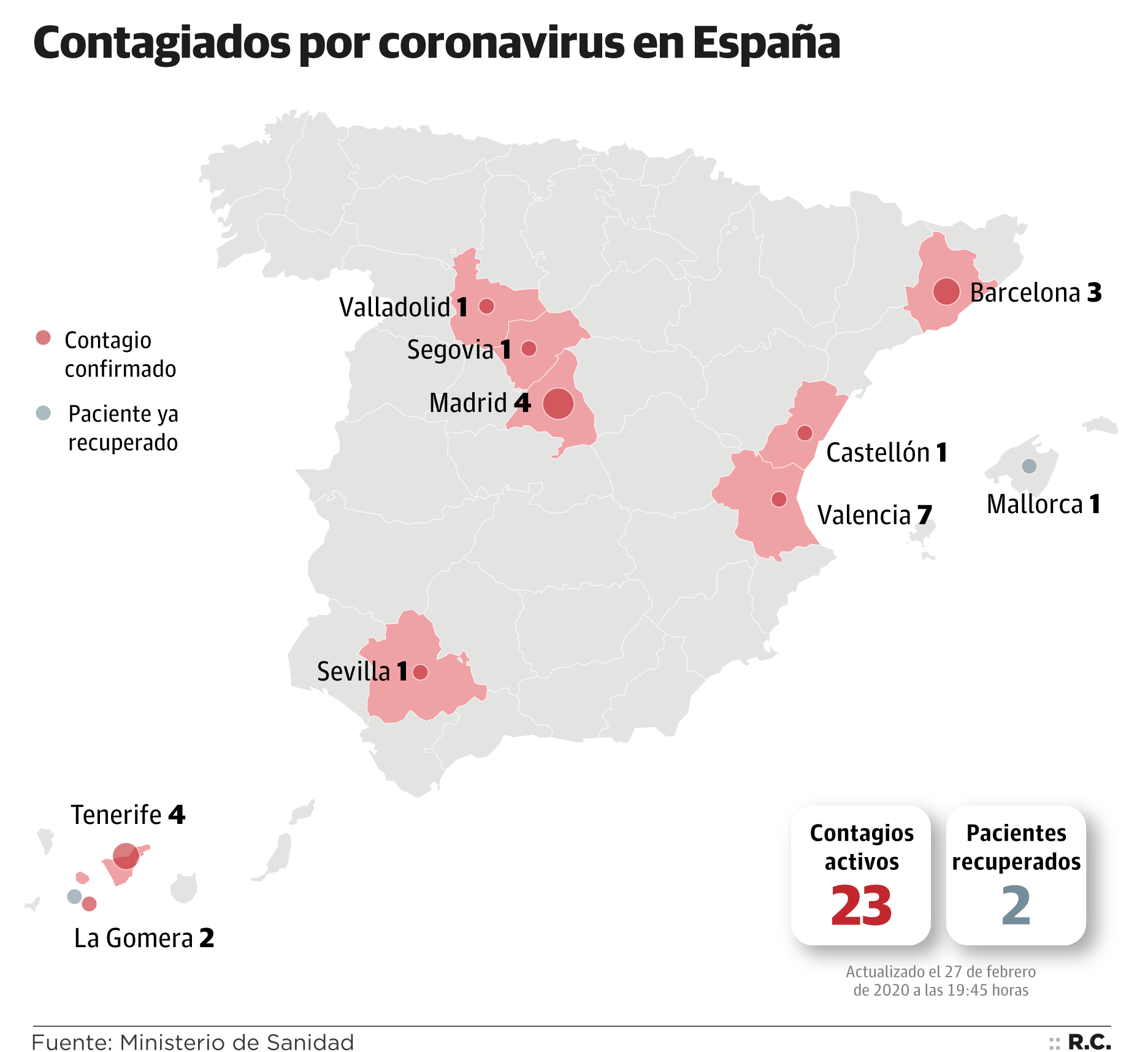Ascienden a 23 los casos activos en el país, tras detectarse nuevas infecciones en Madrid, Barcelona, Valencia, Valladolid y Segovia