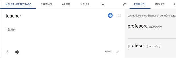 Hasta hace poco, cuando una palabra podía traducirse en forma masculina o femenina, solo se proporcionaba una traducción. No obstante, ahora con una simple búsqueda podemos observar cómo Google Translate ha aprendido de ejemplos existentes en varias traducciones.