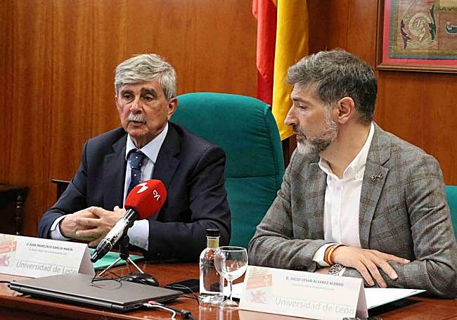 El rector de la Universidad de León y presidente de la Fundación General de la Universidad y de la Empresa (FGULEM), Juan Francisco García Marín, y el presidente del CEL, Julio César Álvarez, han firmado este viernes en la Sala Martín Sarmiento de El Albéitar un convenio marco de colaboración para facilitar el desarrollo de iniciativas que mejoren la empleabilidad de los egresados de la ULE, además de retener el talento en la provincia de León y mejorar la competitividad del tejido empresarial mediante la incorporación de jóvenes recién titulados.