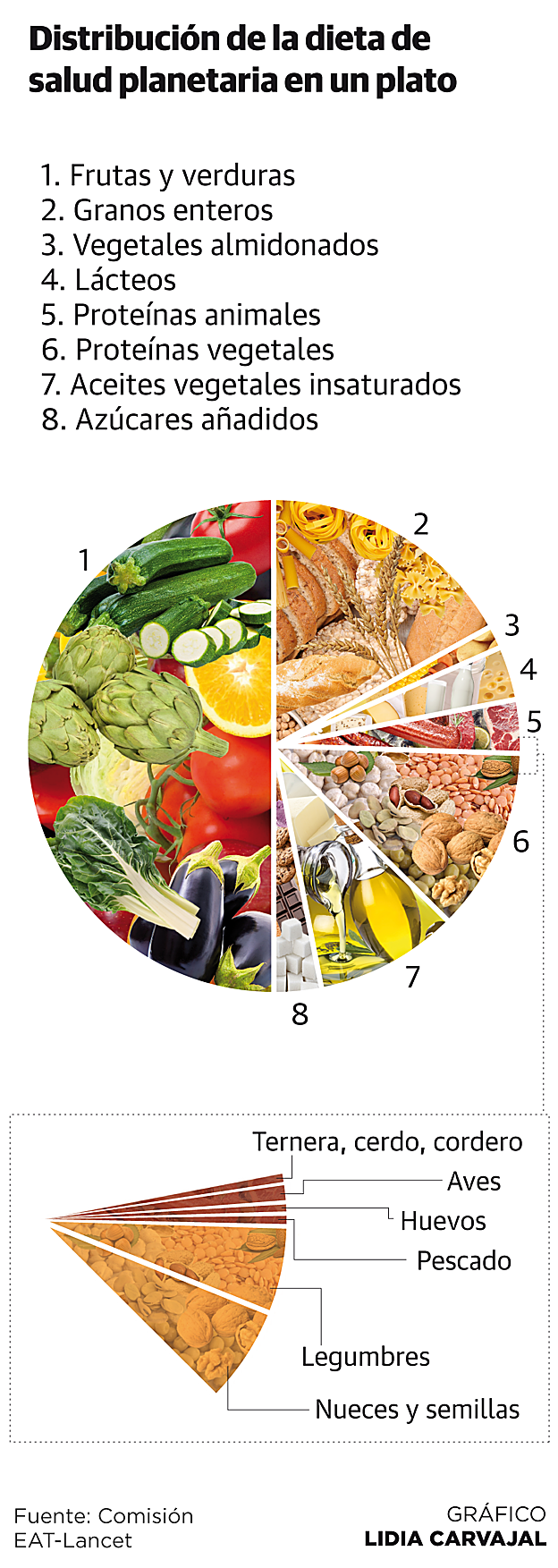 Todo queda concretado en el informe 'Alimentos, Planeta, Salud. Dietas saludables a partir de sistemas alimentarios sostenibles'. La primera página exhibe ya toda una declaración de intenciones: «El consumo mundial de frutas, vegetales, frutos secos y legumbres deberá duplicarse, y el consumo de alimentos como la carne roja y el azúcar deberá reducirse en más del 50%. Una dieta rica en alimentos de origen vegetal y con menos alimentos de origen animal confiere una buena salud y beneficios ambientales». ¿Un ejemplo? Una dieta sana y sostenible solo necesita de 300 gramos de carne a la semana, proponen, 50 gramos más de lo que consumimos en España... al día.