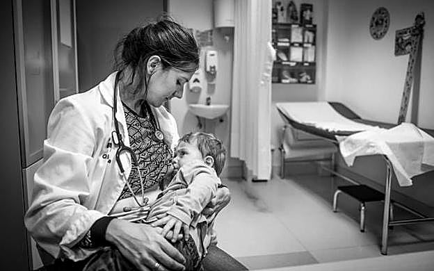 «La lactancia materna, salvo excepciones, es el mejor alimento para el bebé. Durante los primeros 6 meses está completamente nutrido e hidratado y no necesita nada extra. El pecho sigue siendo el alimento principal todo el primer año, pero a partir de los 6 meses es necesaria la introducción de diferentes alimentos de forma progresiva, en distintas texturas y sin forzar para un buen control nutricional. Cuando tienen más de un año la lactancia sigue nutriendo pero pasa a ser un alimento más». La explicación la ofrece Beatriz Pacho (Llodio, 33 años), pediatra del Hospital Alto Deba, que se fotografía dando de mamar a Mikel, de 20 meses, en la consulta. «Yo recomiendo la lactancia materna. ¿Hasta cuándo? Hasta que la madre o el niño quieran. En mi caso los dos queremos y no hemos decidido cuándo dejarlo, no me pongo una fecha en el horizonte».
